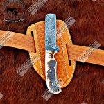 Custom handmade Damascus steel bull cutter knife. Overall length is 8 inches. Handle is made of Ram horn and also come with leather sheath.