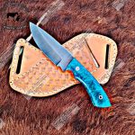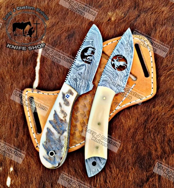 Custom handmade Damascus steel cowboy knives. Over all lengths are 8 inches. Handles are made of ram horn and bone. Also come with leather sheaths. They hold a good edge and still long time…..